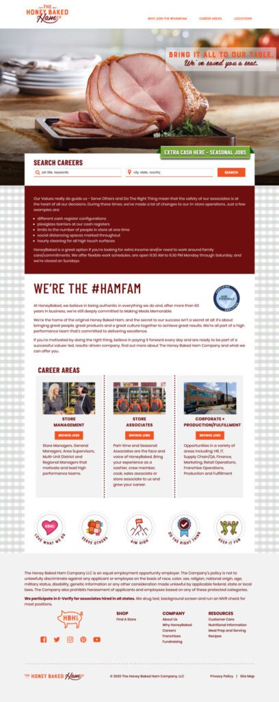 The previous career site showcased clean top navigation and an abundance of information. However, it lacked the pure heart and spirit of The Honey Baked Ham Co. Fast forward to October 2019, and the launch of the organization’s brand-new site!