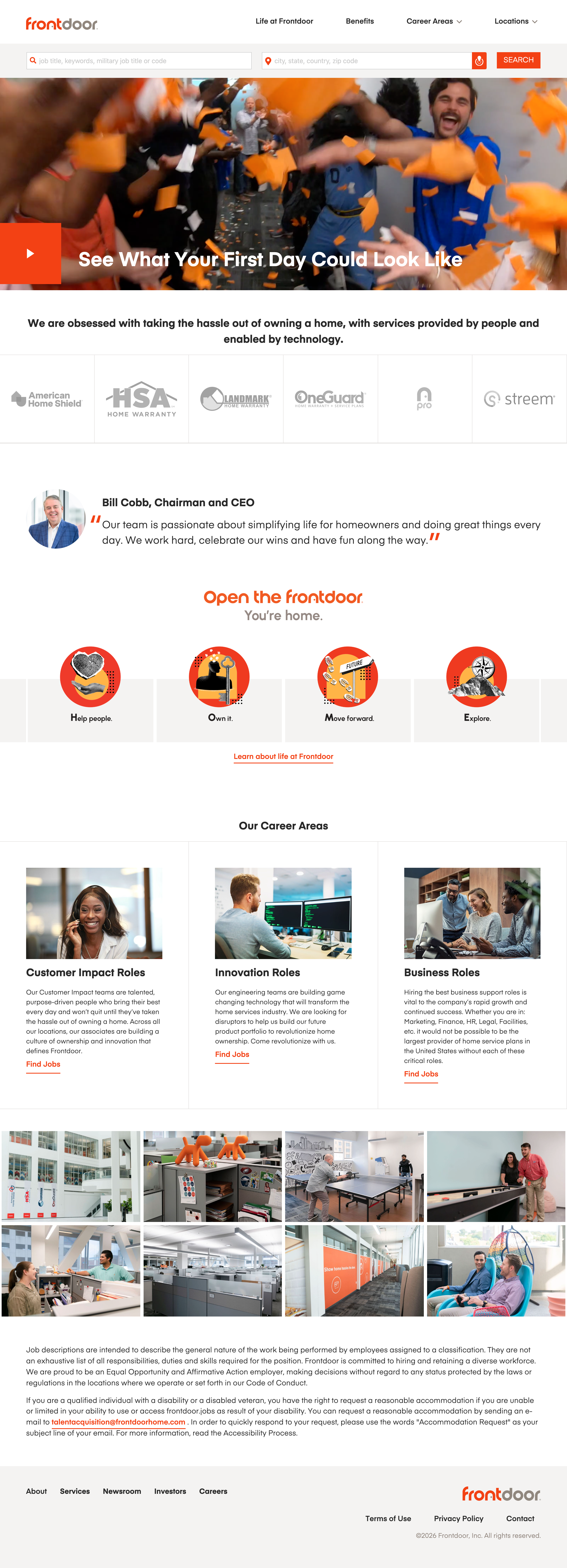 On-site photography and a first-person candidate experience video that authentically captures Frontdoor’s workplace culture, employee interactions, and day-to-day experiences, providing engaging visual content throughout the career site.